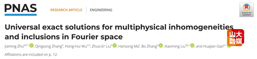 院刊》(PNAS)發表研究論文“Universal exact solutions for multiphysical inhomogeneities and inclusions in Fourier space”。該研究建立了廣義等效夾雜方程通用精確解,統一了單夾雜和多夾雜體系理論框架,建立了多物理復合材料平均模量精確解,提出了任意形狀裂紋應力強度因子通解。這項突破性工作解決了固體力學、固體物理和材料科學等多學科的長期難題。該研究得到了國家自然科學基金、山東省自然科學基金和廣東省自然科學基金等資助。