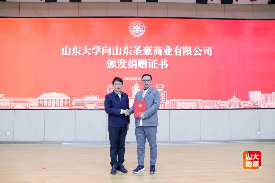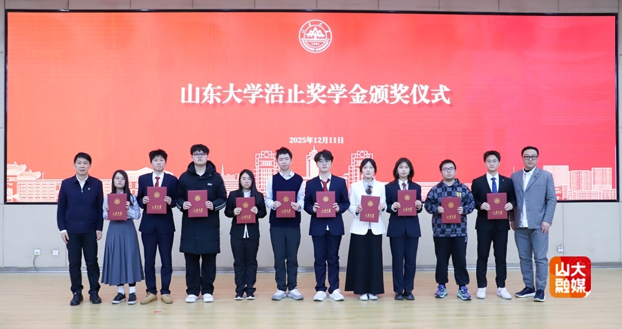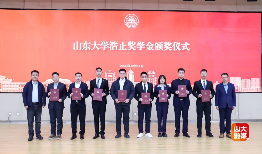 12月11日,“山東大學浩止獎學金”頒獎儀式在興隆山校區舉行。山東大學黨委副書記張帥、山東圣豪商業有限公司董事長杜灝之出席頒獎儀式。