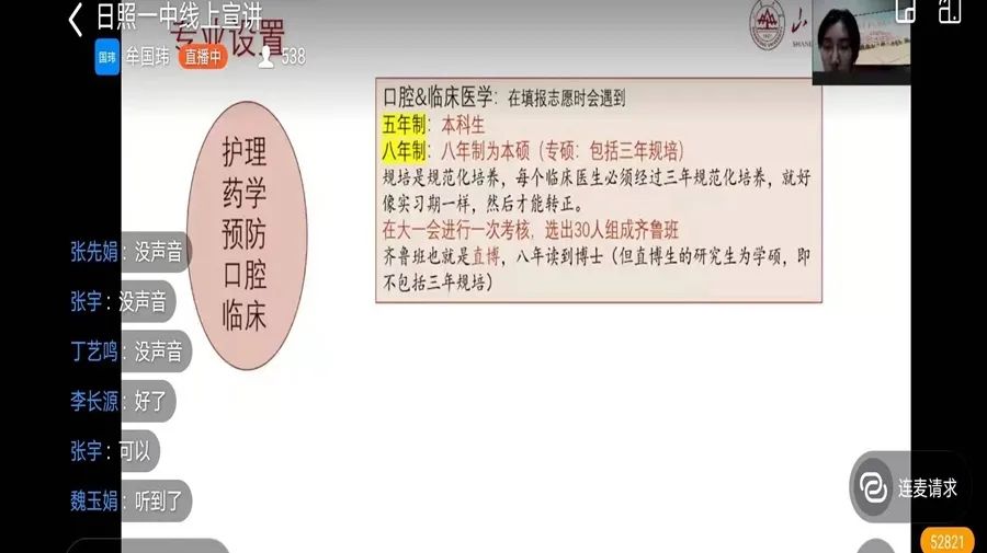 母校宣講活動山東省448隊成員宋金諾參加籌備了近一個月的宣講活動。受疫情影響,本次活動以線上形式展開。宣講團成員積極準備,熱情介紹;宣講對象主要面向高三學子。活動中有500多名家長和同學持續在線觀看。