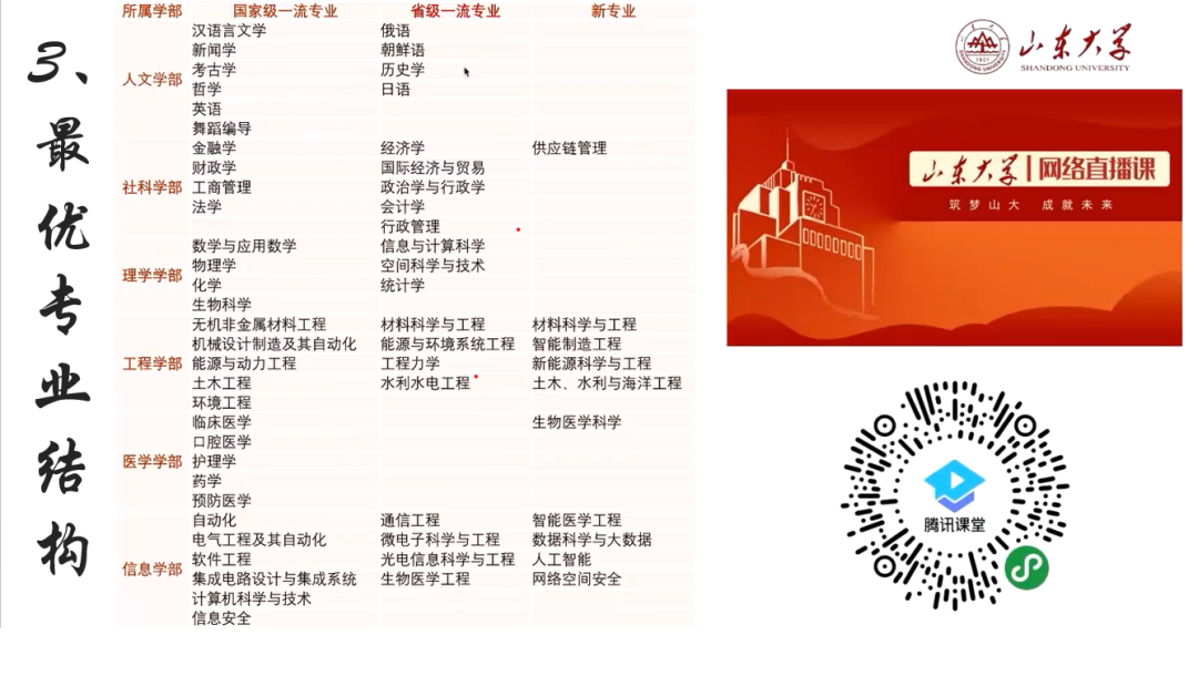 隨后,李霖介紹了山東大學的學科生態和轉專業政策。李霖解釋了山東大學寬口徑培養人才的培養思路,展示了山東大學全面而豐富多彩的通識核心課、通選課和創新創業課程,著重體現山東大學對于學生創新創業能力的重視。