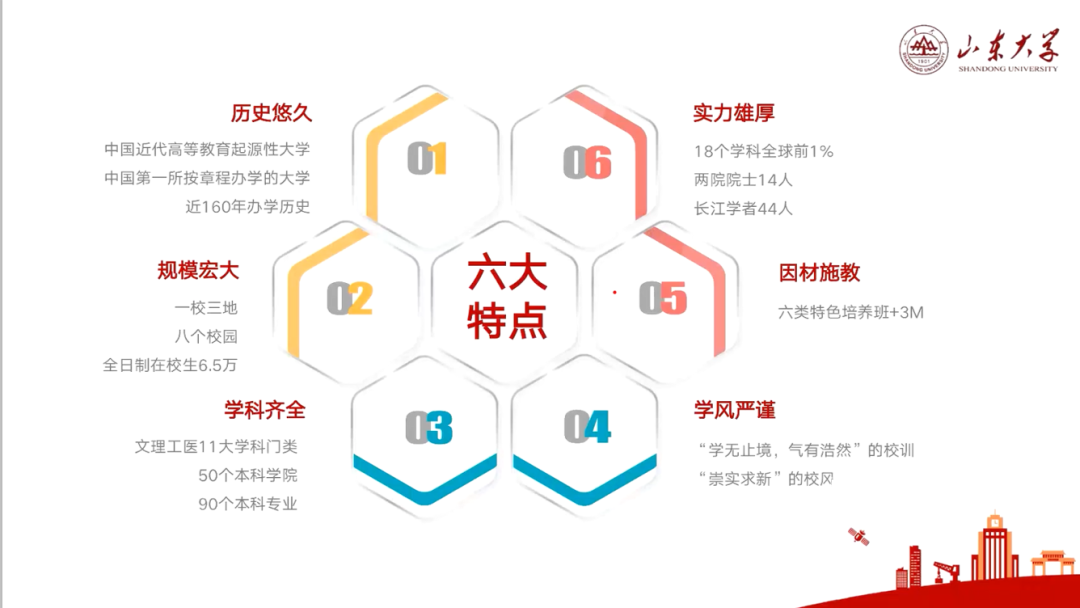 鑒于疫情防控要求,本次會議在線上舉行。本次宣講共分為兩個部分,通過分別對山大概況、山大之最進行講述,宣傳了山東大學“為天下儲人才,為國家圖富強”的形象。