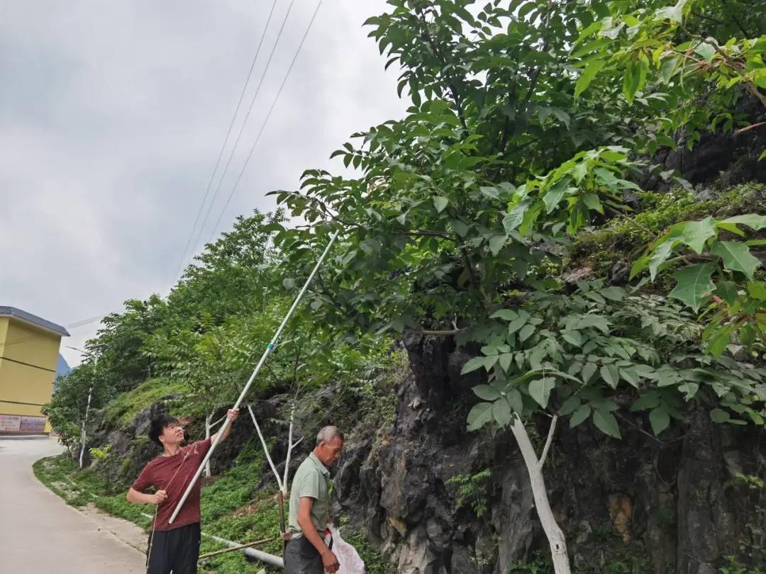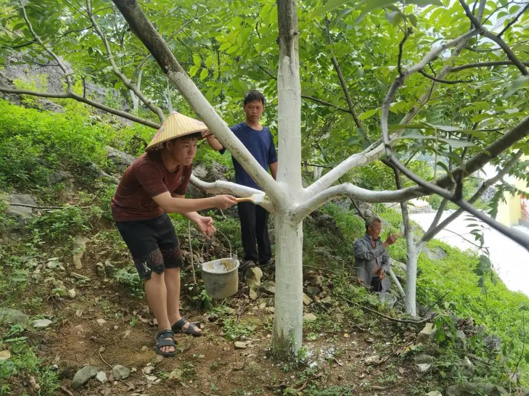 上午八點,隊員們在安蘭村護林員隊長袁家敏的帶領下參觀了安蘭村核桃示范片,安蘭村核桃樹現有成活12191株,廣泛分布于全村25個隊,其中示范片位于龍漢隊和力米隊。袁家敏給隊員們介紹了核桃樹種植培育的注意事項與核桃產業情況。目前安蘭村核桃樹種植處于發展階段,核桃樹種植數目多但結果數量較少,需要護林員和農戶投入更多的精力去修護培養,尚未能給農戶帶來穩定的經濟效應。核桃樹需要農戶定期進行修剪、施肥,還要在季節變化時給核桃樹涂白,防治天蛾蟲、天牛蟲、蛀蟲等害蟲影響。袁庭蔚參與到了核桃樹的修剪,施肥與涂白工作中,并運用所學的邊坡工程知識維修穩固核桃林田土,減少暴雨山間的水土流失。實踐團隊參與完成了十畝120株核桃樹的修剪與涂白工作,隊員在實際的勞動中體會護林員與農戶的工作,在勞動鍛煉中促進了個人的發展。